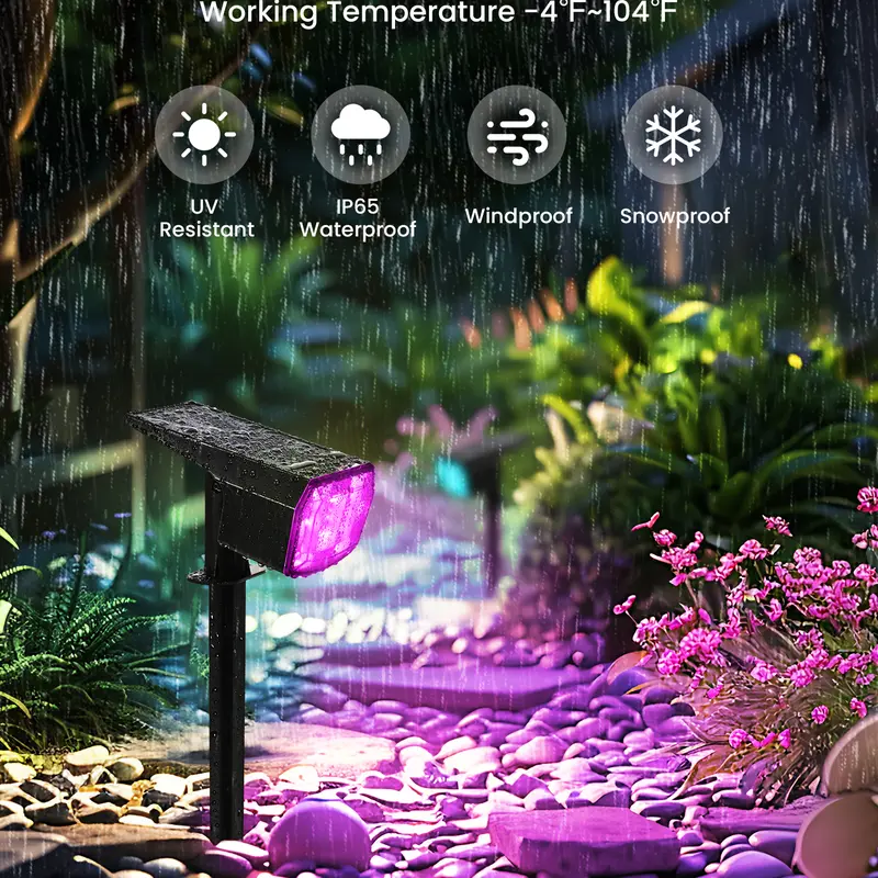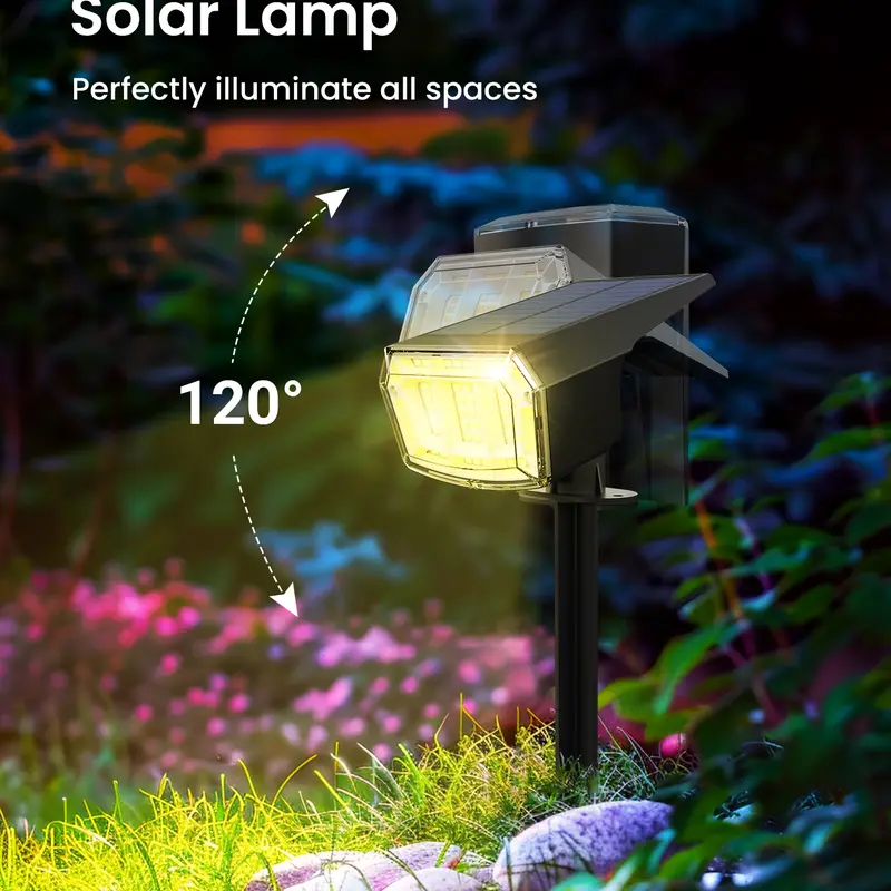 These solar spot lights are engineered for durability, boasting an IP65 waterproof rating, which ensures reliable performance in diverse weather conditions. The adjustable 120° lamp allows for flexible light direction, making them suitable for highlighting specific features or creating ambient lighting. Their 2-in-1 installation design provides options for simple wall mounting or ground staking, offering adaptability for varying lighting needs.