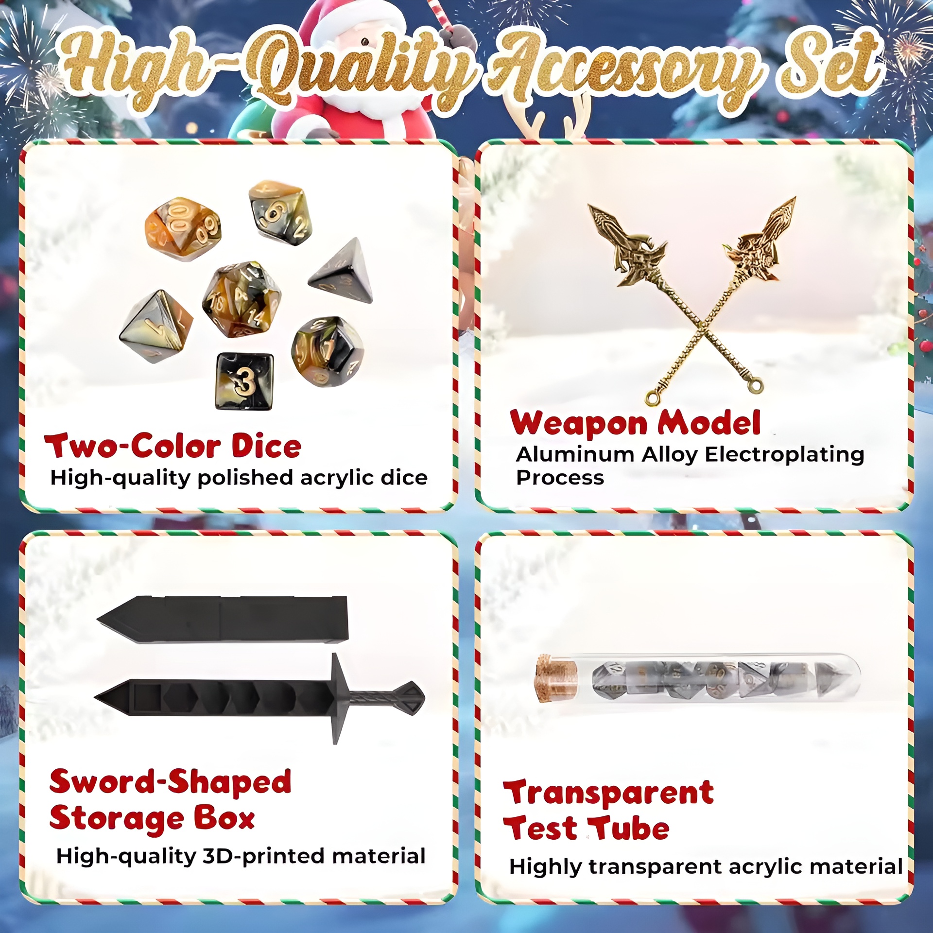 The additional accessories create further appeal. The decorative swords add display utility and support thematic setups. The sword-shaped storage box keeps dice organized, while the glass tube offers a stylish way to showcase special pieces. These components contribute to a complete role-playing collection, making the Advent calendar useful long after the holiday season ends.