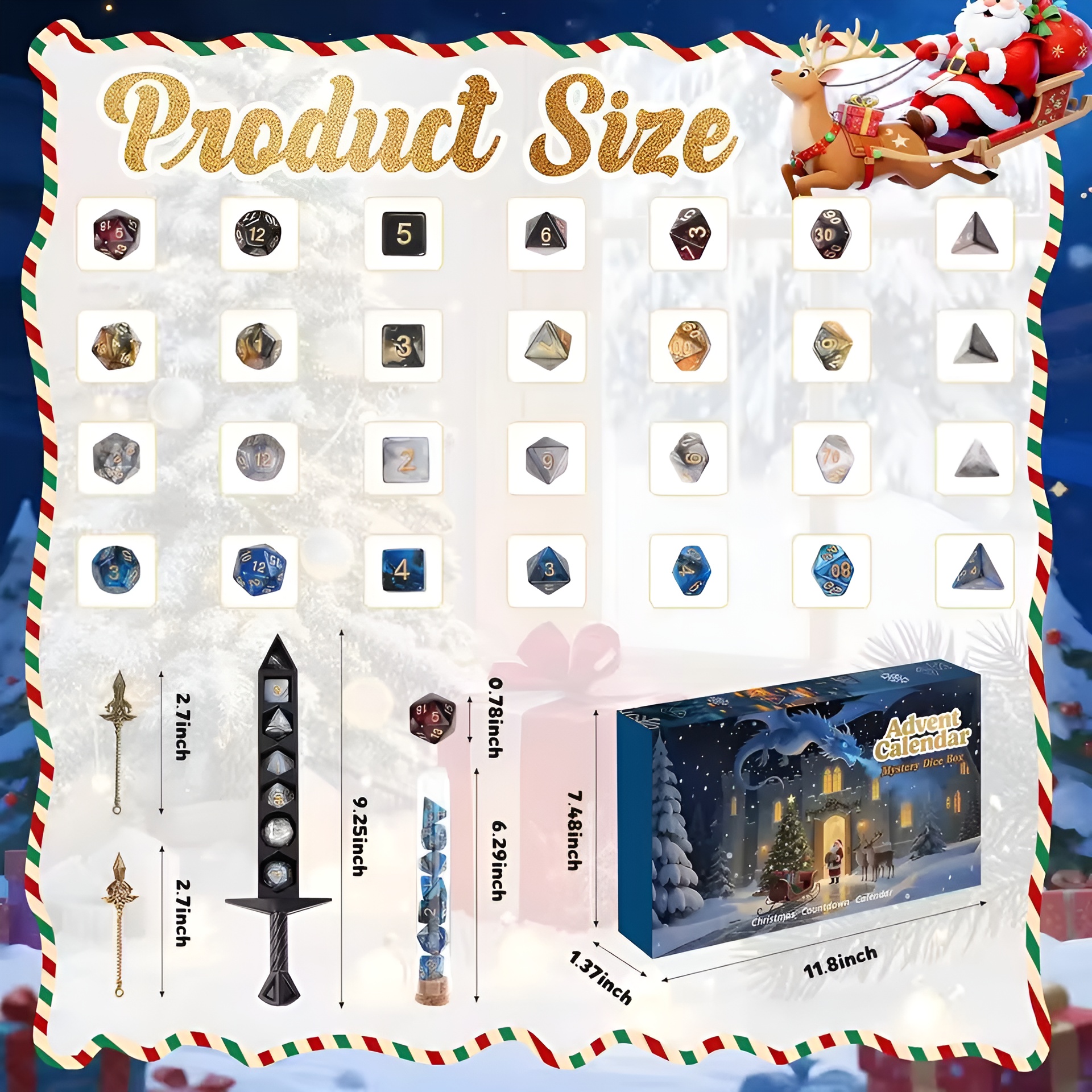 This advent calendar includes a wide range of themed items. Inside the box are twenty-eight polyhedral dice, two decorative swords, one sword-shaped storage box, and a glass tube for display use. These components form a complete set suited for tabletop role-playing activities. The variety offers players plenty of creative options and adds a sense of discovery as they prepare for modern campaigns.