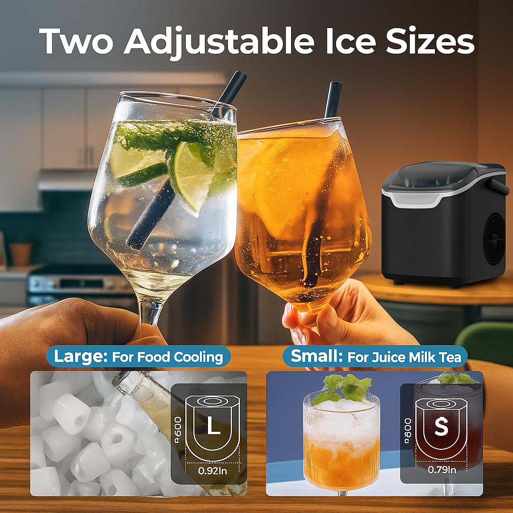 The Countertop Ice Maker Machine, 8 Ice Cubes in 6 mins, 26lb/Day Ice with 2 Sizes- Portable Mini, Energy Saving & Basket/Scoop for Home/Party/Travel/Camping/Bar helps you prepare fresh cubes quickly in daily routines, outdoor events, or temporary setups. This compact unit fits easily on counters, RV shelves, or work tables, keeping your space functional and streamlined.