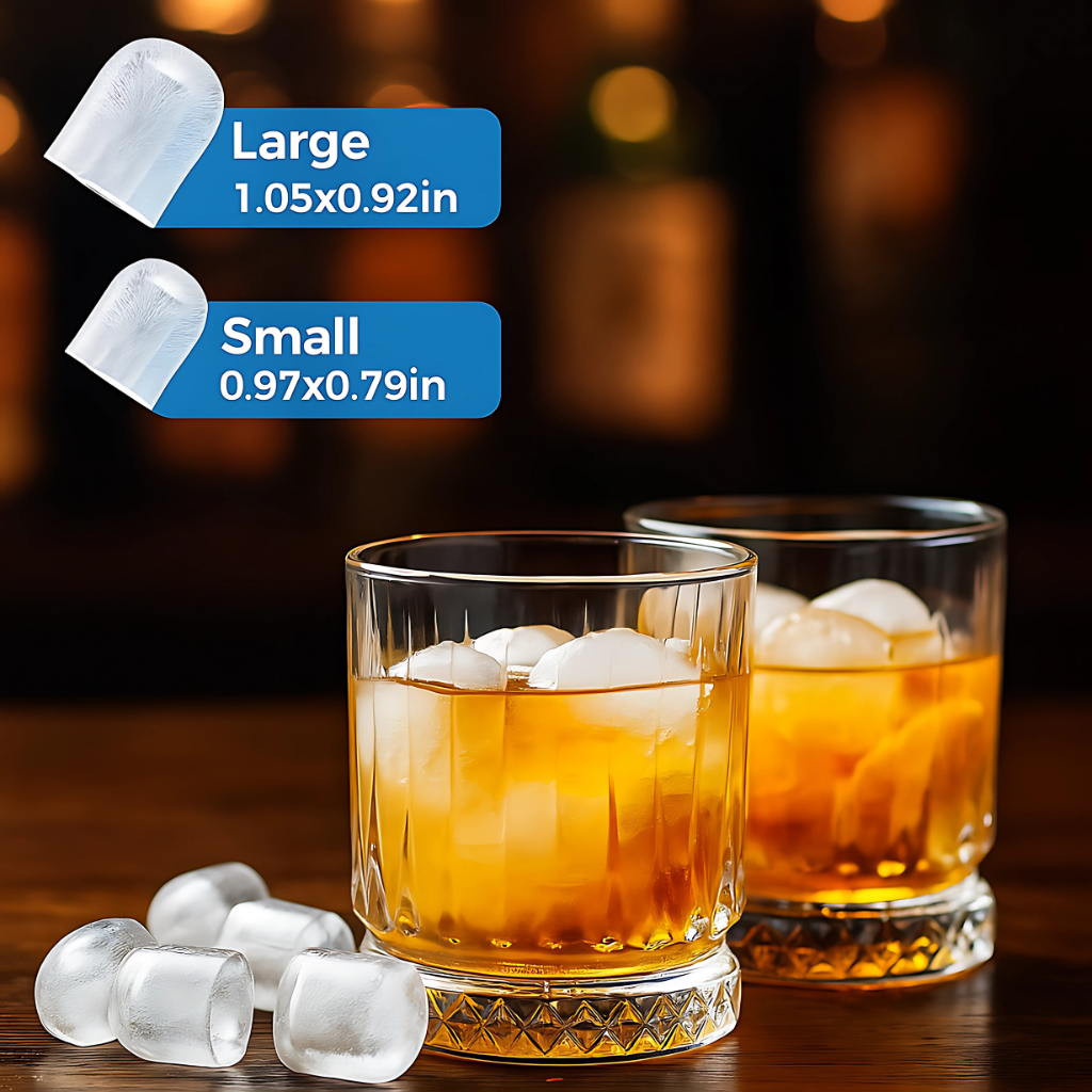 - Two Ice Size Options: Choose between small or large bullet-shaped ice cubes to suit different needs. Smaller cubes work well for chilling drinks quickly, while larger cubes are ideal for cocktails or food presentations.