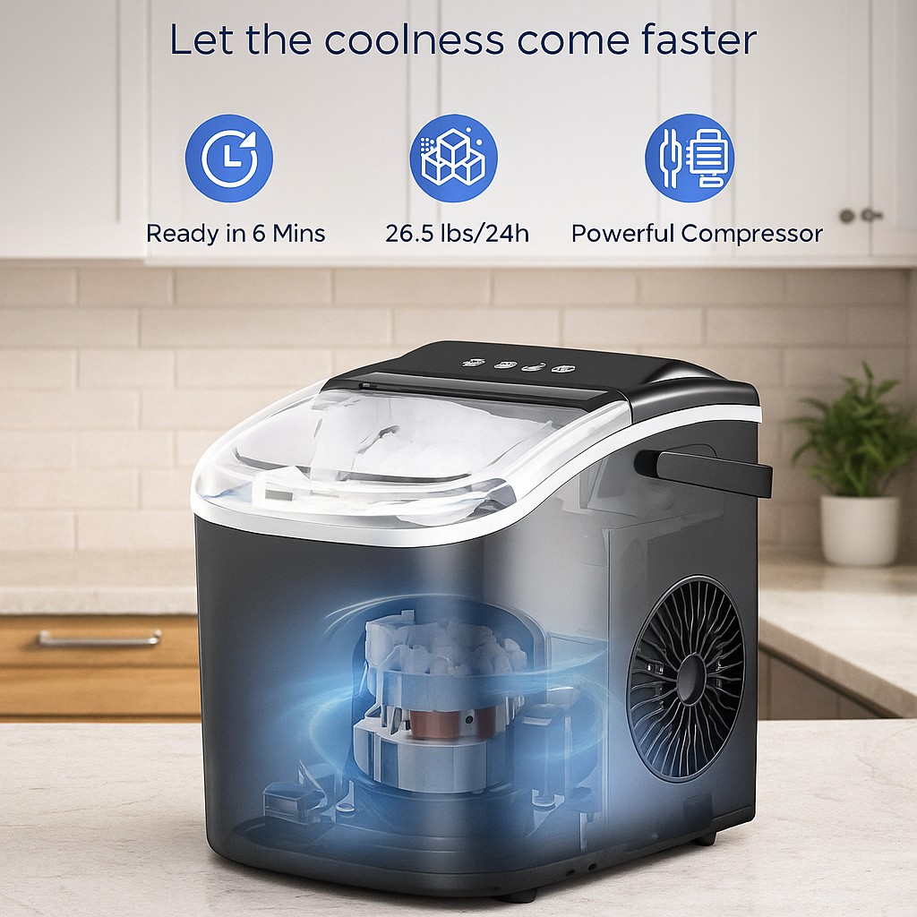 The Ice Maker Countertop Machine combines functional output with compact dimensions and quiet performance. With the ability to create ice quickly, clean itself internally, and store cubes in a removable tray, it covers the core needs of most everyday scenarios.
