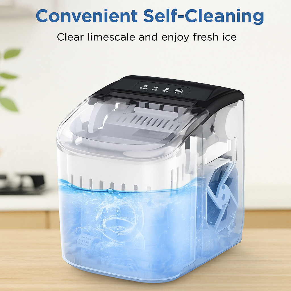 This Countertop Ice Unit includes a built-in self-cleaning mode. With a long press of the primary power button, the internal cleaning function activates and cycles through a cleansing loop.