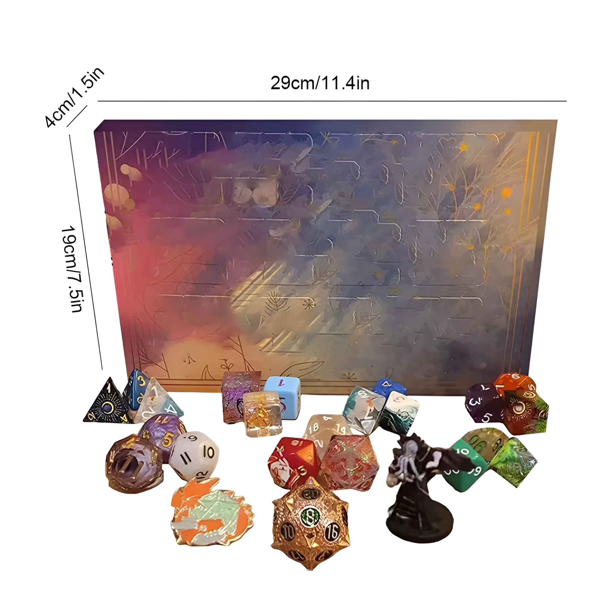 The Dice Advent Calendar With Polyhedral Countdown Set Collection is designed for tabletop players, role-playing enthusiasts, and collectors who appreciate a structured daily reveal throughout the holiday season. This calendar includes twenty-four compartments, each containing a polyhedral die or related gaming accessory. The countdown format supports a steady progression from the first day of the month to the final reveal, allowing users to build a varied assortment of dice suitable for tabletop sessions, display shelves, or personal collections.