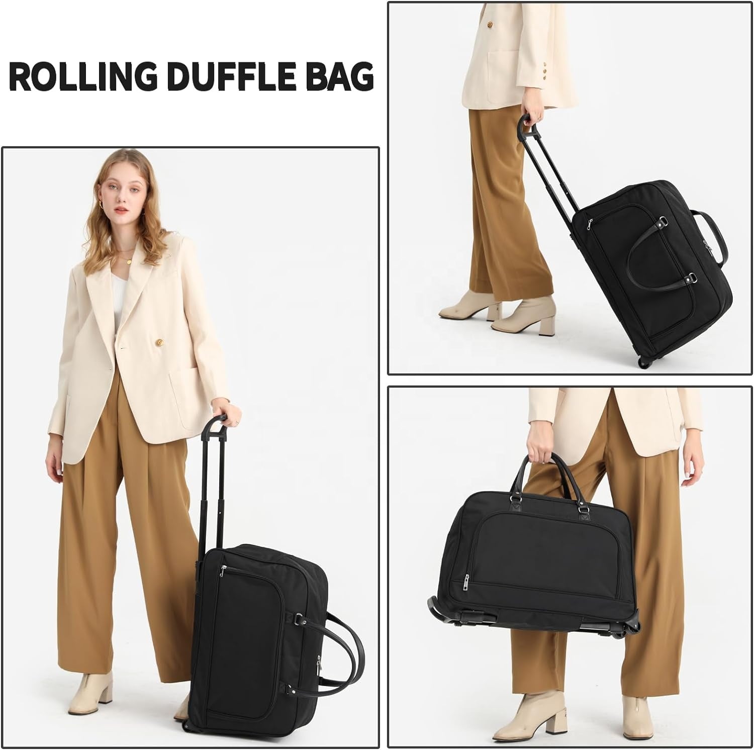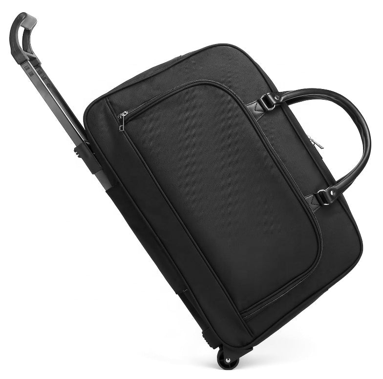 This Duffel Travel Bag With Rolling Wheels is designed for the efficient traveler, combining classic design with functional features. The matte black finish and simple structure provide a professional look, making it an excellent choice for business trips and everyday travel.