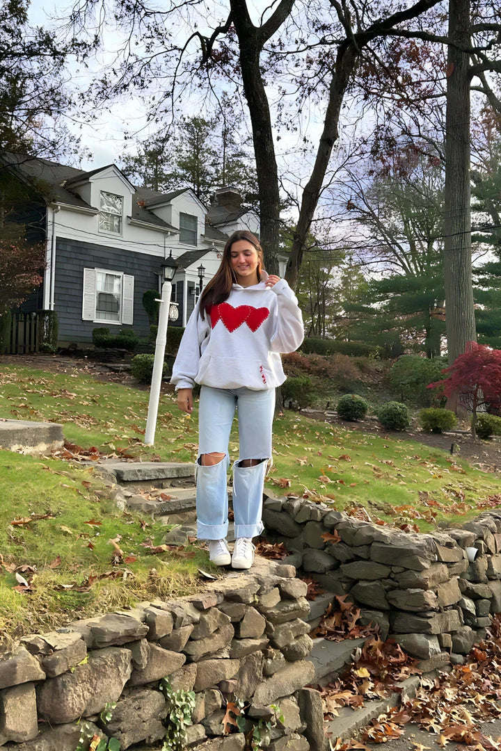 Step out with a touch of whimsy in the Embellished Oversized Hoodie. This comfortable and stylish white hoodie boasts a vibrant red, sequined design, adding a sparkle to your casual look. Perfect for laid-back days or adding some shine to your outings.