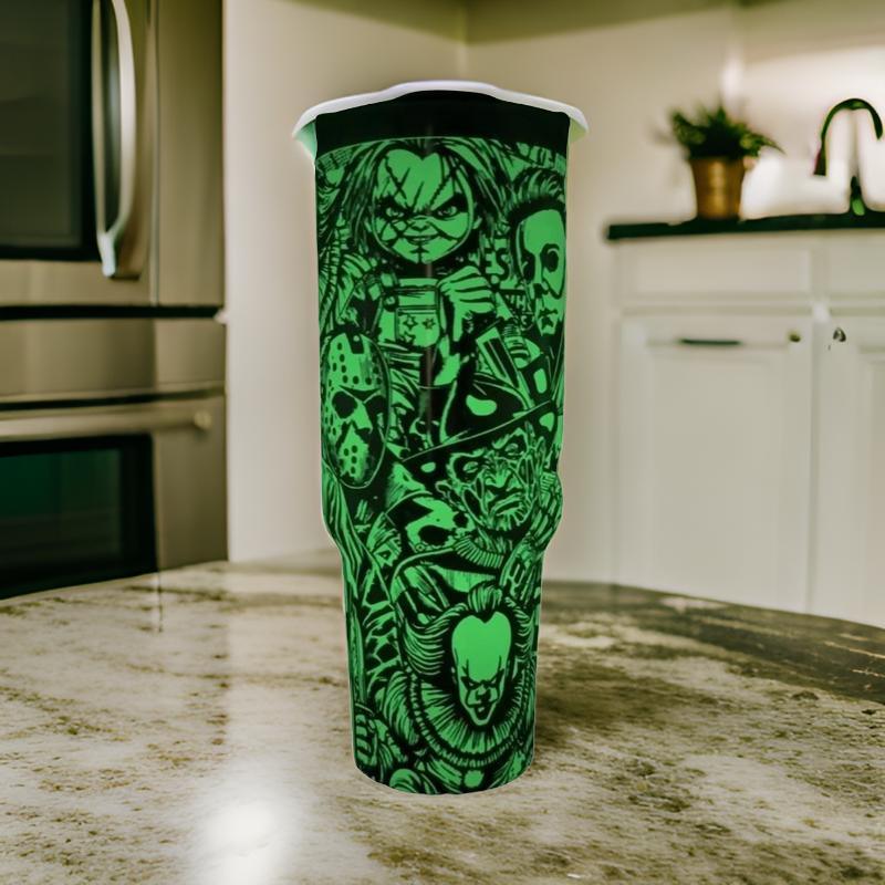 Enjoy a touch to your drinkware collection with this Glow In The Dark Character Printed 40oz Tumbler featuring themed graphics. This tumbler brings eerie vibes to any setting, perfect for fans of classic characters. The glow effect illuminates the designs in the dark, creating a striking and eye-catching look. Designed for both hot and cold beverages, it’s a unique addition for enthusiasts.