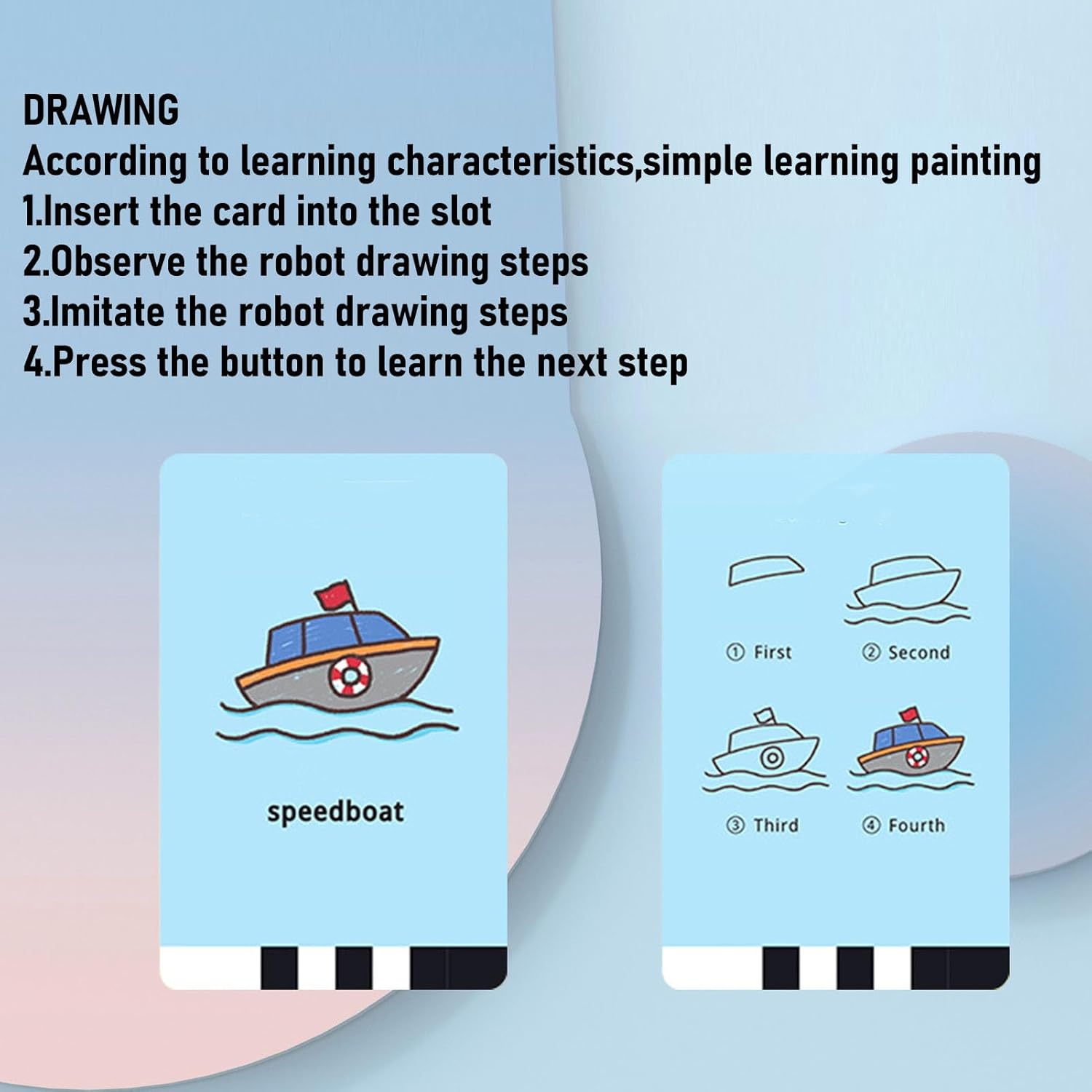 With an inviting look and simple operation, it allows children to draw step-by-step images by inserting cards that guide the robot’s drawing process. As the robot moves, children can follow along and replicate shapes, animals, vehicles, and objects—helping them improve their focus, coordination, and creativity.