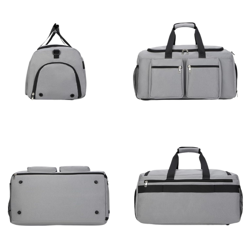 Introducing our multi-compartment travel duffel bag, an ideal companion for your journeys. Designed with practicality and style in mind, it features dedicated spaces for your shoes, accessories, and essentials.