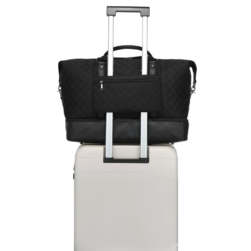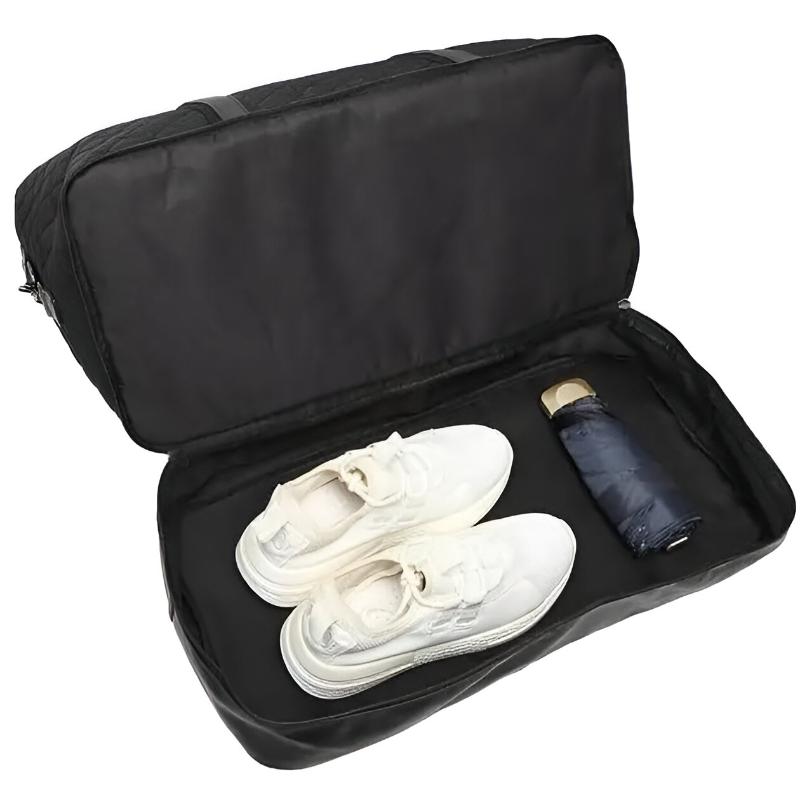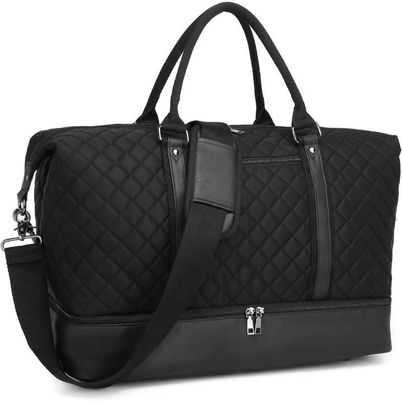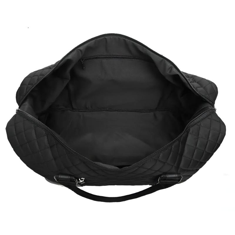 This quilted black travel duffle bag combines elegance and functionality, making it an excellent choice for travelers and gym-goers alike. Its spacious compartments and stylish design ensure you travel with ease and sophistication, keeping your belongings organized and secure.