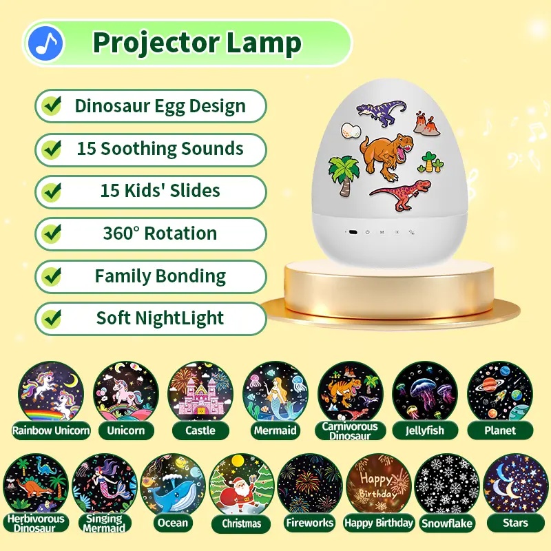 Slide categories include storytelling themes such as Unicorn Castle Little Mermaid and Stars. Learning themes include Dinosaur Astronaut Animals Fruit and Ocean. Celebration themes include Christmas Fireworks Birthday Snow and Monster characters.The rotating projection mechanism distributes images evenly. This helps create a balanced visual environment suitable for evening routines.