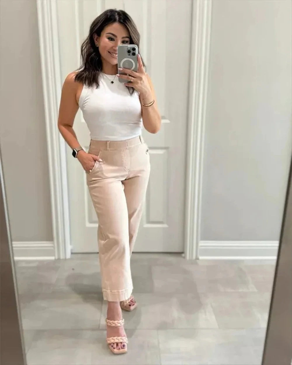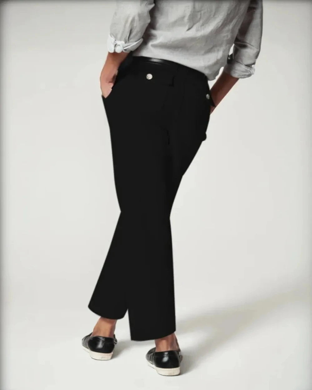 - Pull-on design with no buttons or zippers for a sleek look.