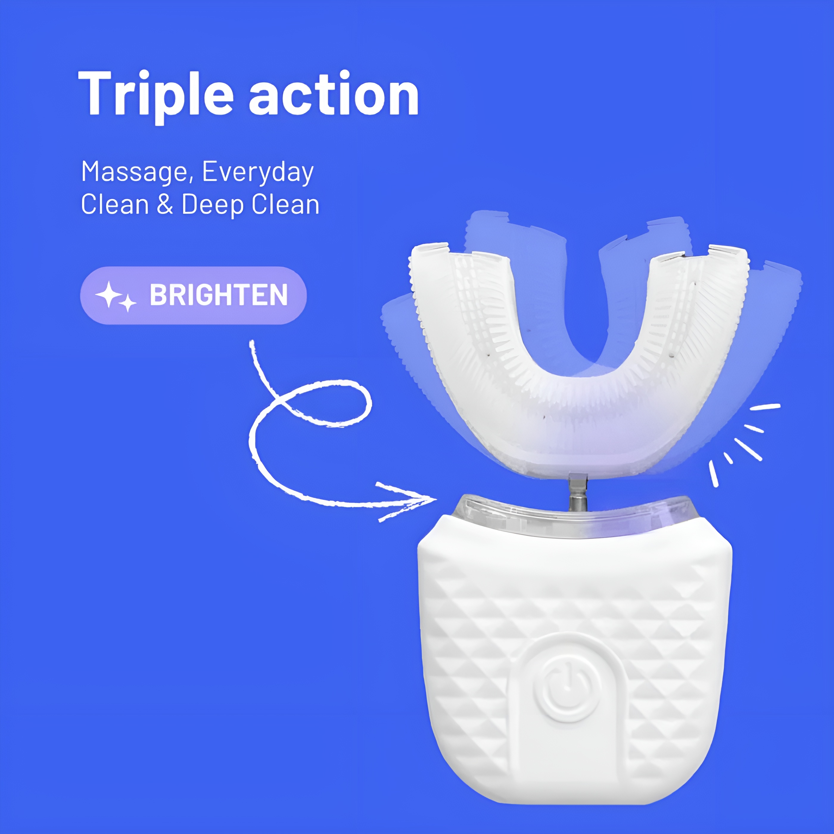 This U-shaped sonic toothbrush offers an efficient full-mouth cleaning solution with a modern design. The silicone electric toothbrush mind surrounds the teeth for quicker coverage, helping reduce brushing time while supporting even results. With its 3-mode sonic brush system, users can choose between gentle daily cleaning, deeper brushing, or comfort massage mode.
