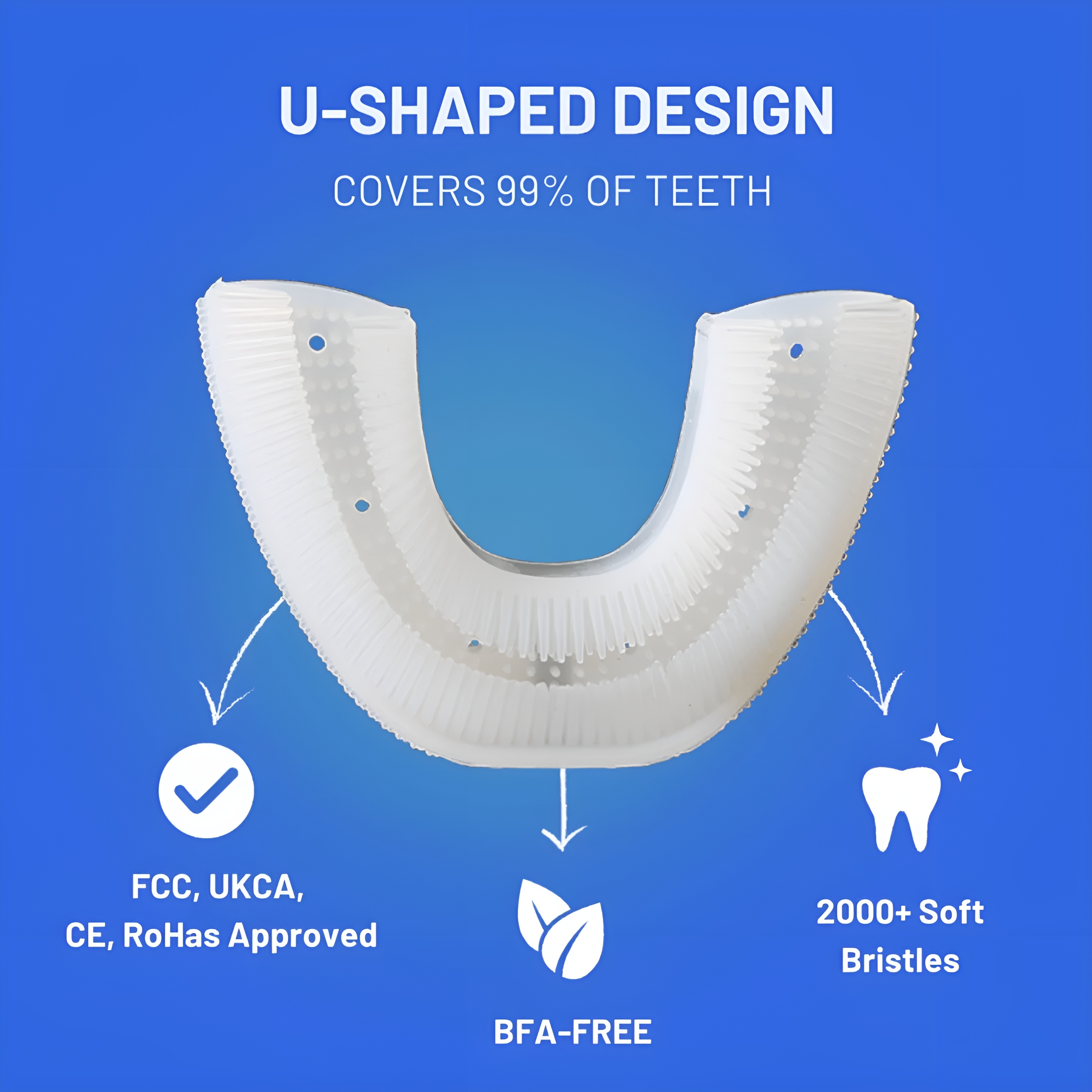 This U-shaped sonic toothbrush is made with a BPA-free silicone brushing-head designed for softness and comfort. The silicone bristles provide gentle contact while supporting effective cleaning coverage. The structure is built for daily use with sonic vibration technology that works across the entire brushing surface.